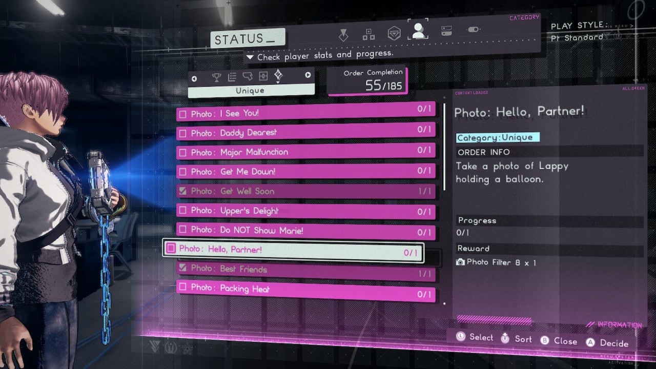 I did not notice the orders menu until I was in the middle of the gameâs fourth file, maybe a third of the way through the game. On one hand, I felt like an idiot for ignoring the obvious red exclamation point in the menu for so long. On the other hand, I suddenly had all the rewards to unwrap, all at once. As fun as that was, donât be a Fahey. Look over the orders menu. Make note of what needs to be accomplished. Especially the orders that require you to take pictures of certain people or events, as I missed a few and had to replay files after I finished the game to catch up.