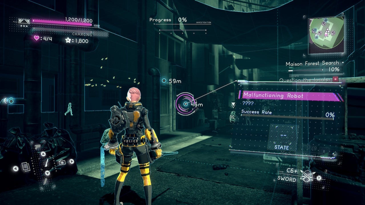 Hitting the plus button on your Switch controller brings up the IRIS, an augmented reality computer that covers the beautiful world of Astral Chain with a wealth of useful information. In the field itâs an invaluable tool for uncovering items and persons of interest. Itâll display side cases, which are optional missions that arenât required to complete the game but are required if you want to S+ rank the gameâs files. I also use the IRIS to poke about headquarters, seeing where everyone is without having to move around too much.