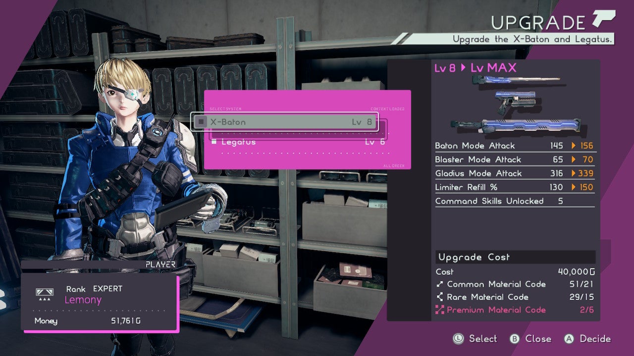 While youâre making your way around HQ, donât forget to stop by the tech room on the third floor to have Tabitha gussy up your equipment. Tabs can enhance the damage and stats of your characterâs transforming X-Baton weapon as well as the Legatus, the device on your arm that helps control your Legions. Upgraded X-Batons do more damage. Upgraded Legatus ⊠Legati? Legatuses? Those let you keep your Legions active longer without overheating.