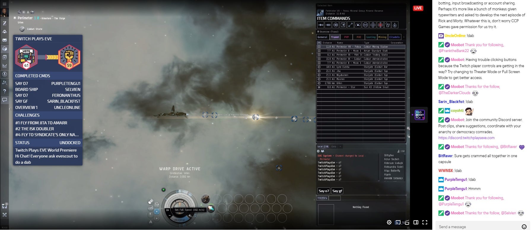 After 40 minutes of the inaugural stream being active, 71 unique viewers had already begun to interact with the system, giving commands to the character and helping to shepherd it through space. The viewers weren’t all just entering random commands either; after about an hour they managed to navigate their vessel through the 10 stargate route between Jita and Amarr, the game’s two largest public trade hubs.
