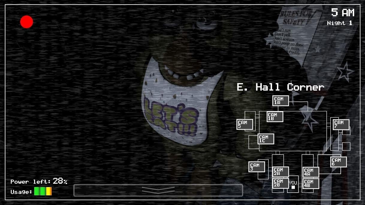 Because pizza is life. Okay, actually, it’s more that the pizza places you oversee are special. Think of them like a messed-up version of Chuck E. Cheese: the establishments are used for kids’ entertainment, and they come stocked with animatronic animals. “Freddy” is one one of those animatronics, and he’s a bear. A very dangerous bear. There are other animatronics too, which include a chicken, a fox, and a bunny, among other ones.