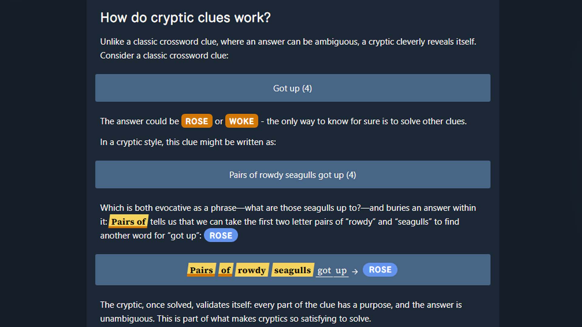 Available today for free, Parseword is a daily, digital spin on cryptic crosswords, a type of word puzzle that has been popular in the United Kingdom for over a century now, but which has never made the leap to the United States, where the “concise” crossword is still king. Concise crosswords offer vague clues that rely on you solving other clues to confirm if you picked the correct word or not. For example, as Parseword‘s tutorial explains, the clue “A four-letter word for got up” could be either woke or rose. You’d have to solve connecting words to verify which answer is desired. In a cryptic crossword, clues contain the answer, and you decipher it via tricky wordplay and rules.