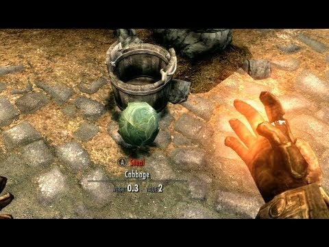 Because you have probably exhausted all quests, side quests, and hoarding possibilities in the latest Elder Scrolls title from publisher Bethesda, now is the perfect time to trick shot some cabbages into buckets. What else were you going to do with that Alteration spell, anyway?