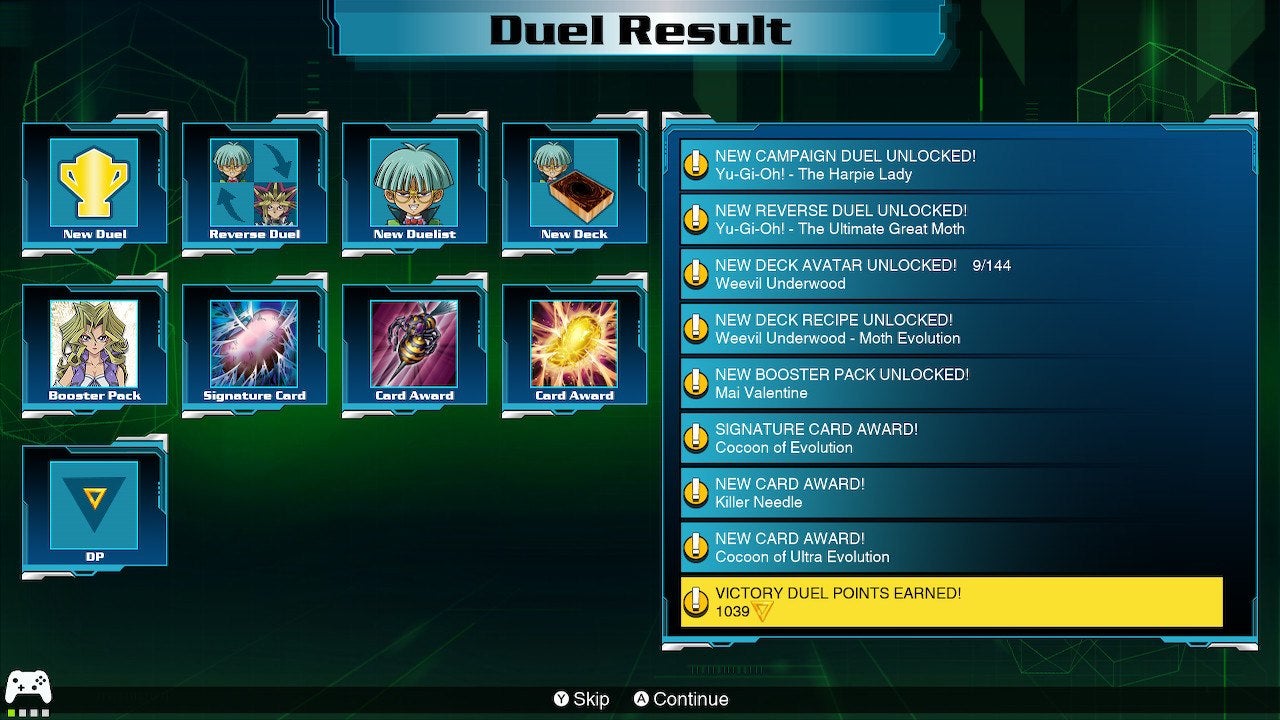 For a solo Yu-Gi-Oh player like me, Link Evolution is an AI opponent wonderland. There are nearly 170 different historical duals in the game pulled from six generations of the animated series. Completing a historical duel, like “The Ultimate Great Moth” fight between Yugi and Weevil which occurred early in the original series, unlocks a reverse duel, allowing fans to switch sides and play as the enemy. Each new battle brings new cards, deck recipes, player avatars, and Duel Points, used to purchase booster packs in the in-game store.